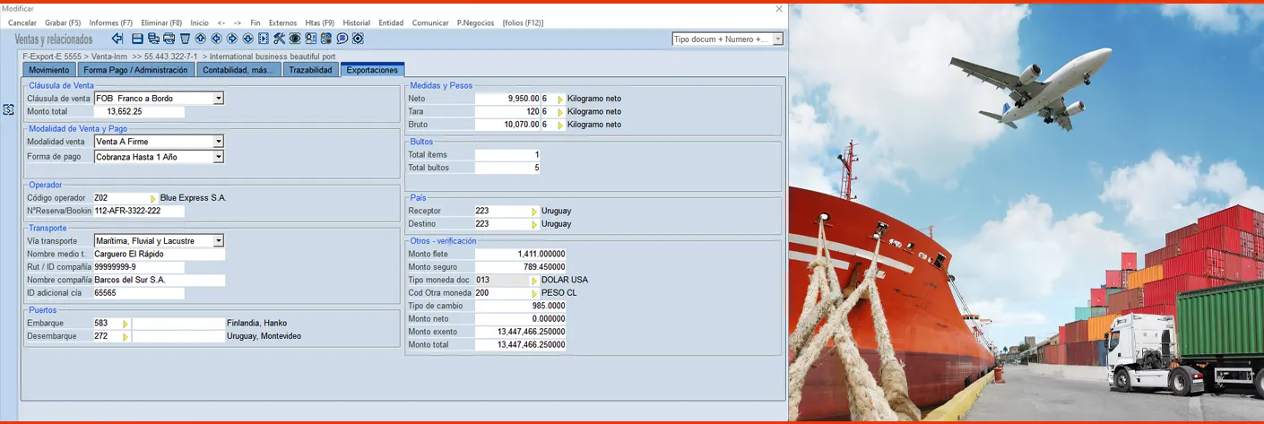 - Entre la información de exportación incluida formalmente están la cláusula de venta, modalidad de venta y pago; operador, transporte; puerto de embarque y desembarque; medidas, pesos y bultos; país receptor y destino; monto de flete y seguro, monedas utilizadas, tipo de cambio y montos correspondientes.