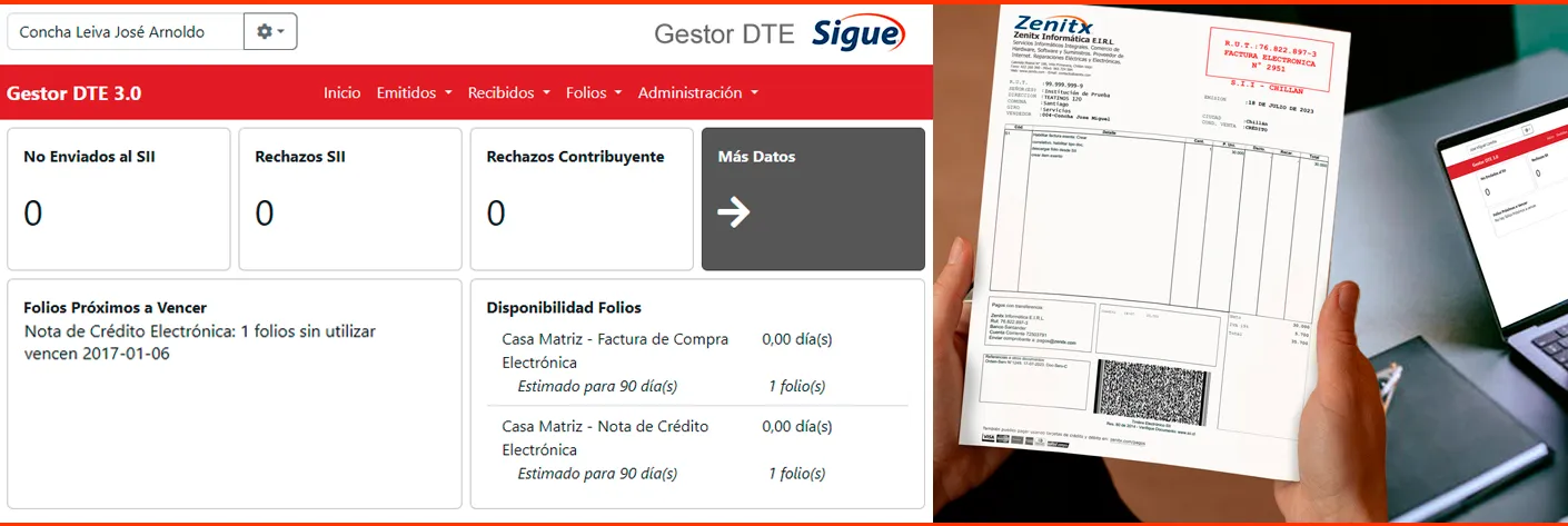 - Entrega información relevante en el Home sobre estado, vencimiento y disponibilidad de Folios; e incluye acceso a un gráfico que permite al usuario encargado hacer ciertos análisis respecto a la emisión de documentos.