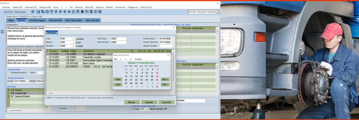 - Órdenes de trabajo o servicio, emitidas en tiempo real; con gestión de diferentes estados; con acceso al stock de productos, los históricos de servicios y cotizaciones del activo atendido y del cliente, los precios y otros, a fin de verificar la información.